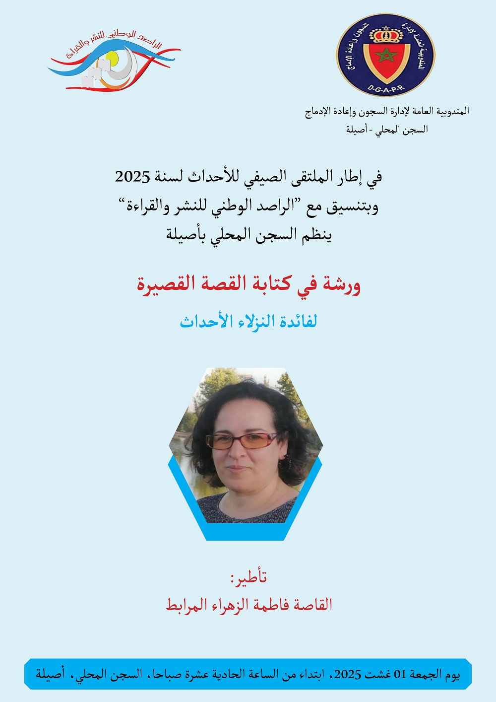 في إطار فعاليات الملتقى الصيفي للأحداث (الدورة الثامنة)، وبتنسيق بين “الراصد الوطني للنشر والقراءة” والسجن المحلي بأصيلة، نظمت ورشة في كتابة القصة القصيرة لفائدة الأحداث، من تأطير القاصة فاطمة الزهراء المرابط. وذلك يومي الجمعة 01 غشت 2025، على الساعة الحادية عشرة صباحا، بالسجن المحلي، أصيلة.